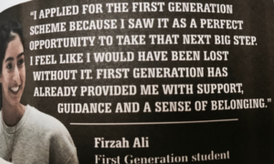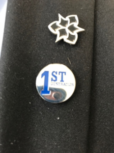 The FirstGen Scheme engages with FiF students in the final years of their schooling and then provides ‘wrap around services’ to support this cohort as they move through their degree. The types of additional supports include pre-access (summer school) workshops on preparing for HE, networking with employers and alumni during their degree and then post-graduation support for employment. Interestingly this program is partially funded by MMU alumni many of whom are FiF to graduate university as well – this ‘giving back’ is not only financial (participants receive a 1,000 pound bursary) but also project benefactors are requested to volunteer their time to both mentor FiF students and also attend social/networking events. The First Gen scheme is clearly framed within a celebratory discourse and as Helen explained: ‘we try to promote the scheme as something unique’ , later elaborating that students are encouraged to feel they are part of something special. This positive discourse is echoed in the publicity around the program which I came across in various mediums – including a pin that Peter wore to the interview: