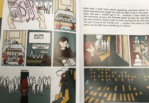 Firstly, Clare provided me with a series of booklets that have been converted into a larger ring bound book for first year students. The booklets draw upon the narratives of FiF students with brilliant illustrations that depict some of the issues that these students encounter in their journey into HE. All the narratives are based upon actual student stories so there is a realism to these contexts and situations – some images below from the story of Alice who struggles with loneliness and isolation: