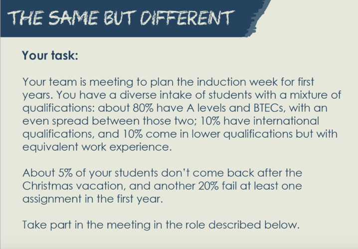 However, working with students is only part of the process – Dr Rachel Forsyth provided details of the ‘same but different’ resources – all of which are available as pdf downloads at the following link (or cut and paste: https://www.celt.mmu.ac.uk/induction/same-but-different/index.php). These resources are designed to challenge staff thinking around deficit discourses and encourage ‘outside the box’ reflections about how best to support and engage diverse student cohorts. Rachel also agreed to be interviewed for this fellowship and pointed to the importance of the ‘relational’ in the HE environment and also, the need to develop ‘the cultural competence of staff’.