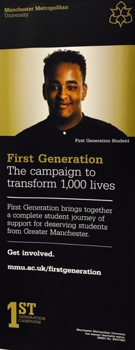 The FirstGen Scheme engages with FiF students in the final years of their schooling and then provides ‘wrap around services’ to support this cohort as they move through their degree. The types of additional supports include pre-access (summer school) workshops on preparing for HE, networking with employers and alumni during their degree and then post-graduation support for employment. Interestingly this program is partially funded by MMU alumni many of whom are FiF to graduate university as well – this ‘giving back’ is not only financial (participants receive a 1,000 pound bursary) but also project benefactors are requested to volunteer their time to both mentor FiF students and also attend social/networking events. The First Gen scheme is clearly framed within a celebratory discourse and as Helen explained: ‘we try to promote the scheme as something unique’ , later elaborating that students are encouraged to feel they are part of something special. This positive discourse is echoed in the publicity around the program which I came across in various mediums – including a pin that Peter wore to the interview: