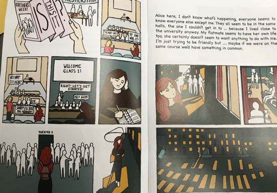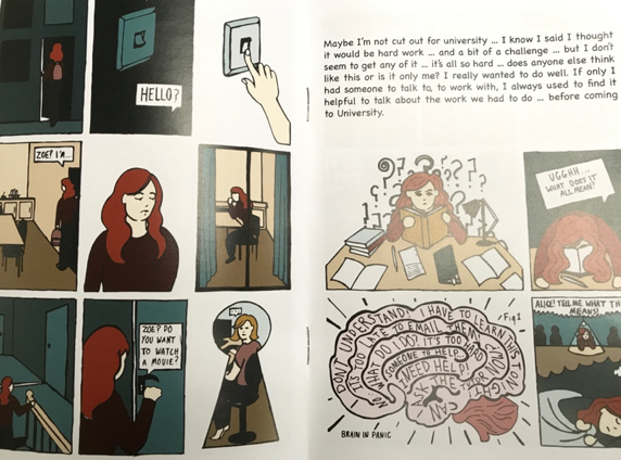 Firstly, Clare provided me with a series of booklets that have been converted into a larger ring bound book for first year students. The booklets draw upon the narratives of FiF students with brilliant illustrations that depict some of the issues that these students encounter in their journey into HE. All the narratives are based upon actual student stories so there is a realism to these contexts and situations – some images below from the story of Alice who struggles with loneliness and isolation: